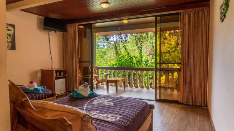 Prefer staying in a quiet hotel? Then Roca Negra Del Arenal is perfect. From the hotel, you have a fantastic view of the volcano, and there’s a beautiful garden with lots of flowers, plants, tropical birds, and other animals. You’ll stay in a spacious room with a small terrace and a hammock. For warm days, there’s a pool, and for cooler days, there’s a jacuzzi.