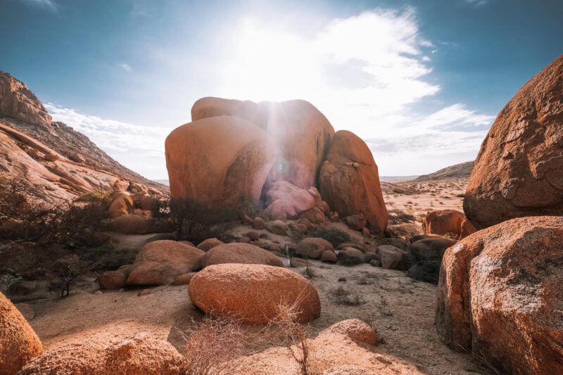 You’ll notice the diverse landscapes of Namibia when you drive from the Grootberg Pass to Spitzkoppe. The sharp rocks give way to gigantic round orange stones. In the middle of the vast plain, the Spitzkoppe mountain suddenly appears out of nowhere. This is the perfect place for an adventurous hike or climbing expedition. Here, you can camp among the giant rocks and witness the most beautiful sunsets. Check out our tips for Spitzkoppe to see all the things you can do and the most beautiful camping spots.
