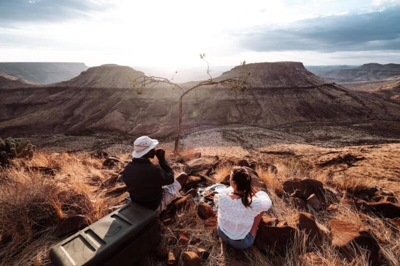 After a few days filled with safaris, it’s time for a change of pace. The next destination is the Grootberg Plateau located in the Damaraland region. In this area, you’ll find the desert elephant, the largest elephant species in the world. One of the activities you can do here is to seek out these giants. We opted for a different activity: the Santana (Sundowner) Drive. With a guide from the beautiful Grootberg Lodge, you embark on a journey across the flat Grootberg Plateau. The drive itself isn’t very thrilling, but in the end, you’ll arrive at one of Namibia’s most stunning viewpoints, where you’ll watch the sunset while enjoying your favorite drinks and tasty snacks. A magical moment! Check out our tips for Grootberg in advance to make the most of your visit.